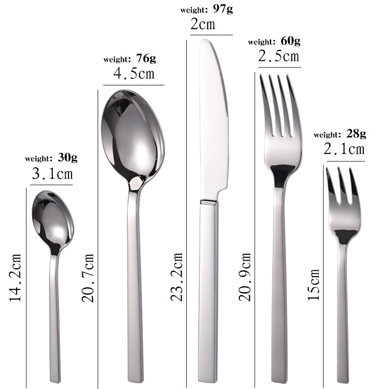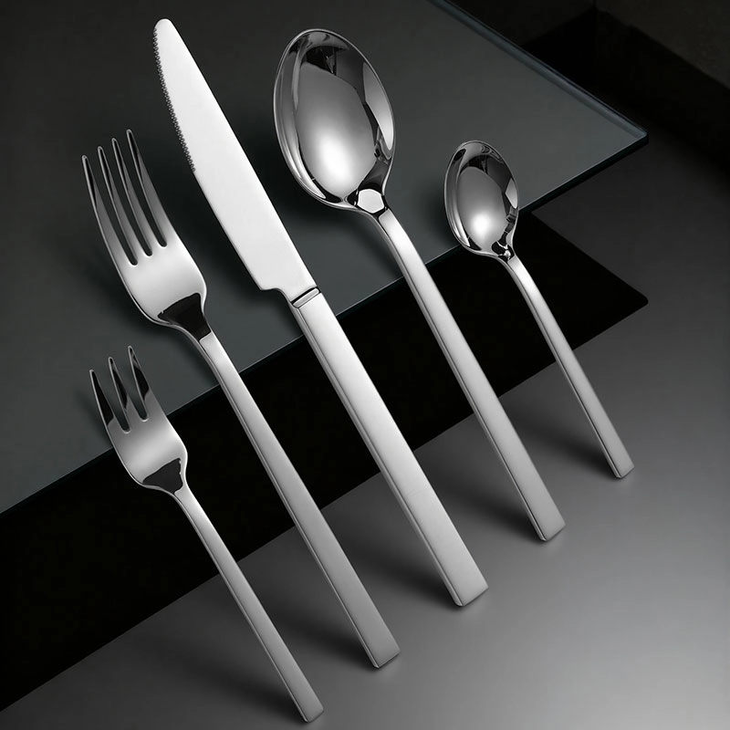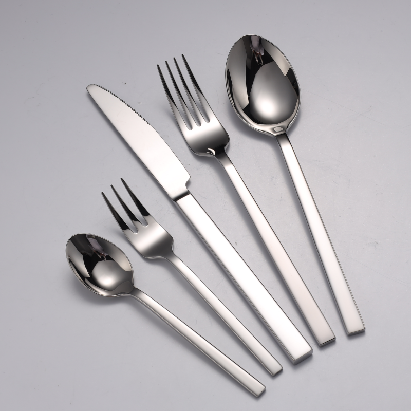 طقم أدوات مائدة عصري بالجملة، أدوات مائدة بمقبض مربع، أدوات مائدة فضية مصقولة بمرآة فضية مخصصة