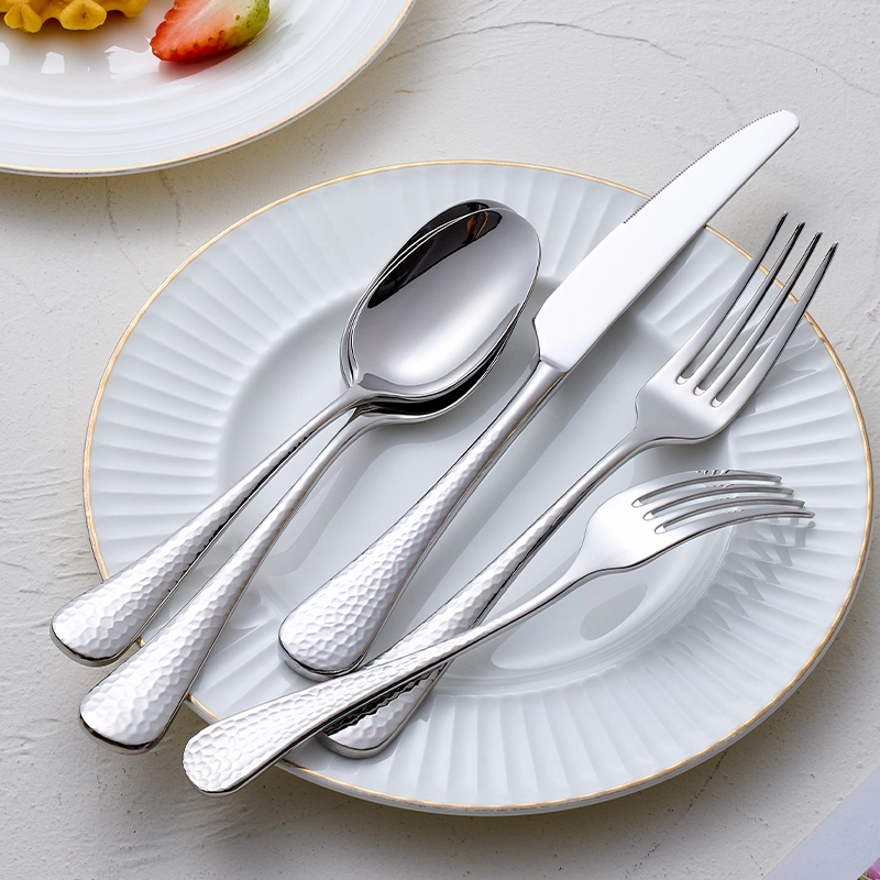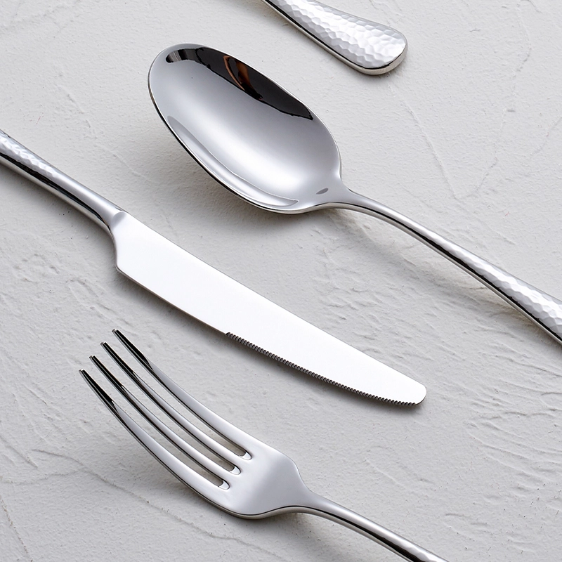 Custom flatware set hammered features a handcrafted hammered texture and weighted ergonomic design for a refined, durable dining experience. Built for hotels and restaurants, it ensures long-lasting performance under heavy use. We provide complete set options for one-stop sourcing. Contact us for wholesale pricing and custom cutlery set solutions.