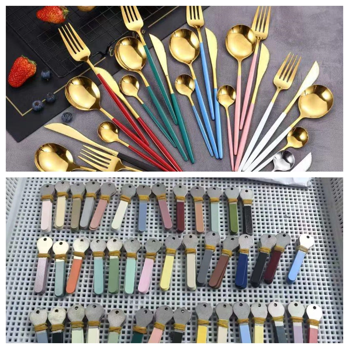 Powder coating uses dry powder that sticks to the metal with static electricity. The coated flatware is then baked at high temperature so the powder melts into a solid, protective layer.